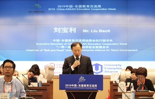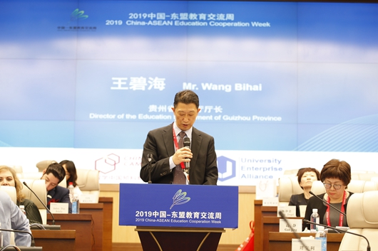 王碧海总结了近年来贵州省依托中国-东盟教育交流周(以下简称“交流周”)平台,促进本地高校对外开放,设立中外合作办学的项目和机构的丰硕成果。他表示,省教育厅将会继续加大支持贵州国际教育合作与交流的力度。他相信,以交流周为平台,通过大学和企业共同参与,必将为教育合作交流探索更为优化的模式,提供更多务实合作的机会。