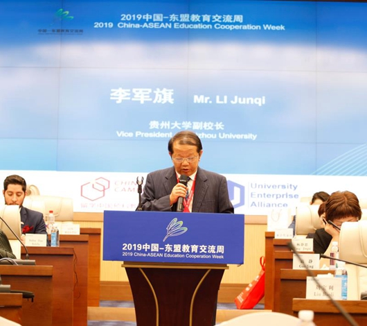 李军旗致辞。他说,自贵州大学主办、承办交流周活动以来,交流周不仅成为了贵州教育对外交流的重要品牌,更是贵州大学加强与东盟各国高校沟通交流的重要平台。贵州大学先后与泰国、新加坡等东盟国家的60余所高校或科研机构签署合作协议,选派交换生赴东盟国家高校进行学习,留学贵大的东盟国家学生人数都在不断增加。贵州大学希望有机会与在座教育界嘉宾加强合作与交流。