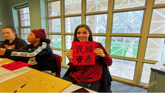 普莱斯比学院修读中国书法的大学生们在课堂上练习书写“国泰民安”之后纷纷表示:“中国加油,希望中国早日战胜暂时的困难,恢复繁荣。”